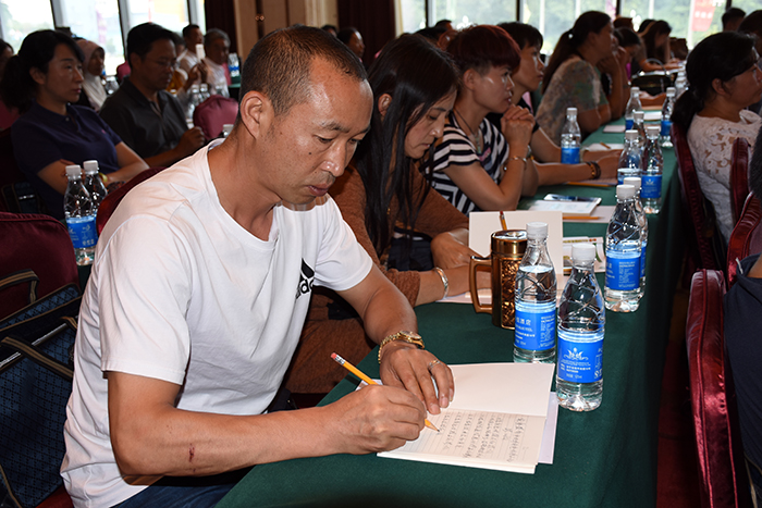 受培訓(xùn)內(nèi)容啟發(fā),家長們爭先恐后地與唐老師互動交流,大膽說出了自己想對孩子說的心里話。讓家長們意外的是,在發(fā)言結(jié)束,還欣喜地收到了書法老師韋昌毅精心為大家準(zhǔn)備的作品,并連連稱贊老師的書法精湛。整個培訓(xùn),唐老師獨特、活躍的方式,博得了家長們的陣陣掌聲。