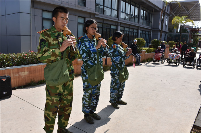 到了敬老院同學(xué)們立馬給老人們送上了蘋果,還主動(dòng)到老人身邊扶著老人散步、推著輪椅陪老人看風(fēng)景、陪老人們聊天、給老人們按摩,一張張稚嫩的笑臉和一雙雙慈祥的目光碰撞出“家”一樣的和諧、溫馨。聽說老人們喜歡看表演,孩子們就為老人們唱起了軍歌、表演了軍體拳、跳手語舞、演奏葫蘆絲等。豐富的節(jié)目博得了老人們的好評(píng),掌聲不斷響起,幾位老奶奶也開心地送上了自己的拿手表演,整個(gè)院兒里充滿了掌聲和歡笑聲。