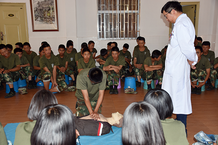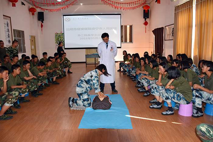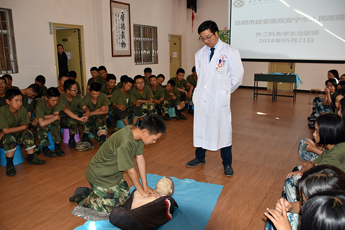 2018年5月21日下午,為全面提高全校學生對突發(fā)事故的科學、緊急救護能力,我校特邀請昆明市延安醫(yī)院安寧市人民醫(yī)院外二科主治醫(yī)師朱華、陸峻,護士胡亞瓊等專業(yè)醫(yī)護人員到校為孩子們開展應急救護培訓。