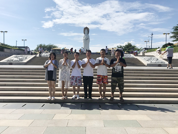 9日上午,第一站就是南海觀音。到了這里,大家頗為震撼。108米高的海上觀音圣像矗立在蔚藍(lán)色的大海之上,巍峨壯觀,實乃世界造像之最。敬建工程因其規(guī)模宏偉、意義殊勝、佛理底蘊豐富,被譽為世界級、世紀(jì)級的佛事工程。那圣潔的白與純凈的藍(lán)融在一起,讓人不禁想到“海天佛國” 四個字!