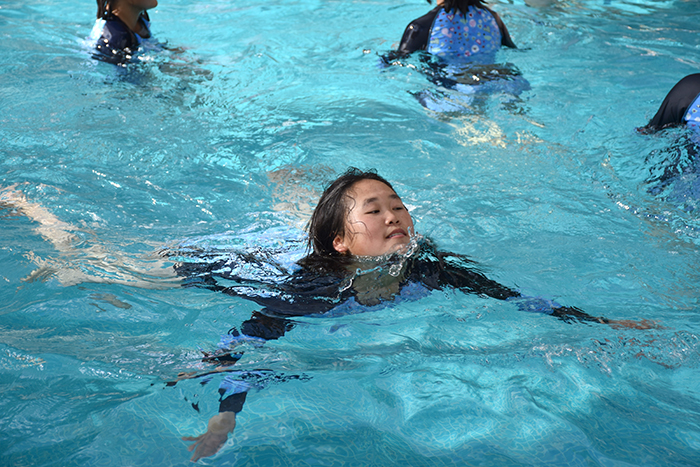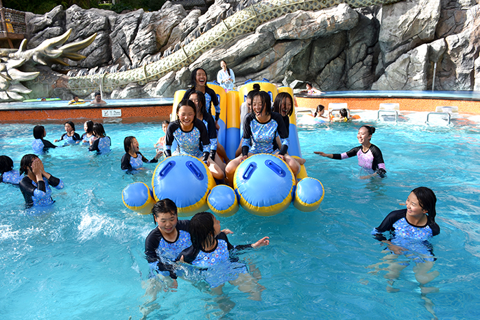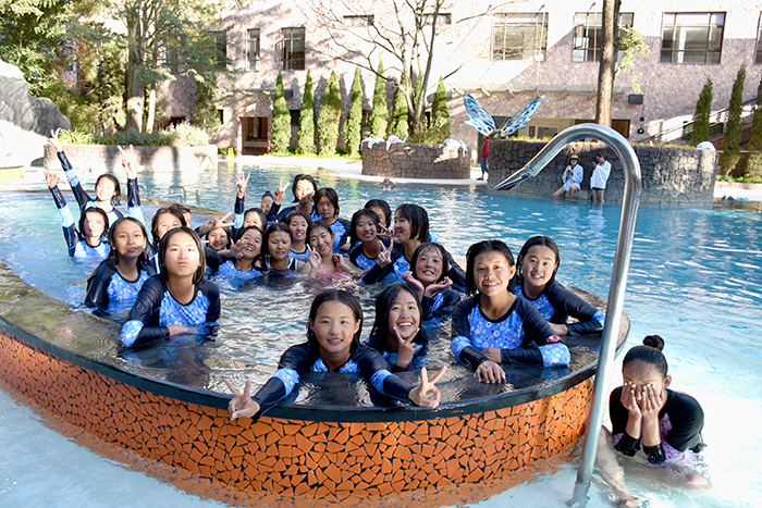 泳池中,同學(xué)們還不時(shí)搞下惡作劇,上一秒還在友好地討論著如何提高游泳技術(shù),下一秒就趁其不備,開始了水中的潑水大戰(zhàn),好似在過潑水節(jié),也讓人情不自禁聯(lián)想到冬天打雪仗的情景。此刻,想象和現(xiàn)實(shí)沒有差距,在水中,無論男生還是女生,都玩得不亦樂乎。盡情玩耍后,會(huì)游泳的孩子還開始了游泳比賽,其他孩子自動(dòng)分為兩列站在水中,為比賽的同學(xué)加油打氣。游泳池中,顏色明快統(tǒng)一的泳衣,清脆開心的歡笑聲,成了溫泉中一道亮麗的風(fēng)景線。說來也神奇,在這樣的氛圍中,之前怯水的同學(xué)不知不覺就克服了恐懼心理,也能在水中自如地走來走去。