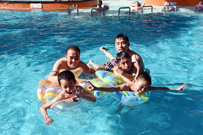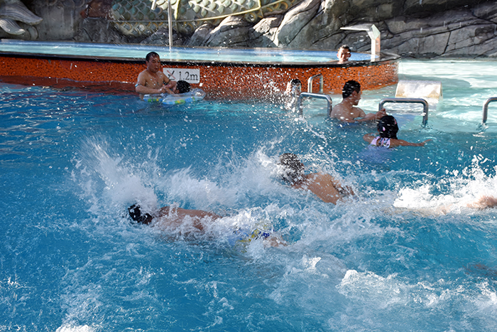進(jìn)入溫泉,潔凈的游泳池立馬映入孩子們的眼簾,大家忍不住下去嬉戲。有的縱身一跳,扎一個(gè)猛子,已在池子的中央;有的小心翼翼扶著樓梯慢慢試著走入水中;有的膽怯怕水,有的個(gè)子小,遲遲不敢入水,老師就把提前準(zhǔn)備好的救生圈套在脖子上,并在旁邊加強(qiáng)保護(hù),扶著他們緩緩向水中其他同學(xué)靠近。放眼望去,有的同學(xué)水性好,一下去就像魚兒在水里歡快地游來游去,惹得不會(huì)游泳的同學(xué)羨慕不已,有的只敢站在水里,置身水中感受。孩子們?nèi)齻(gè)一群、兩個(gè)一伙地在水里靜靜放松身心,要不就是你給我捶捶背,我給你按按肩,亦或是在水中玩起了老鷹捉小雞的游戲。