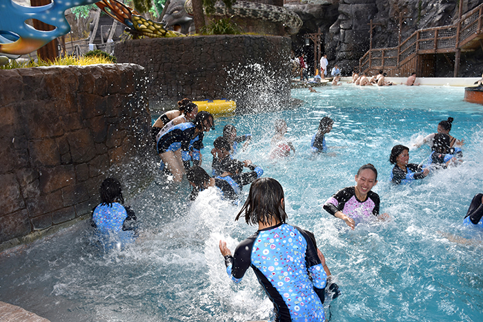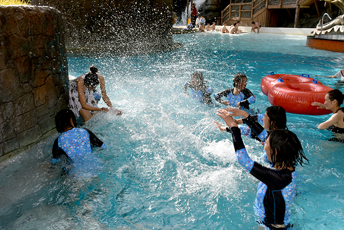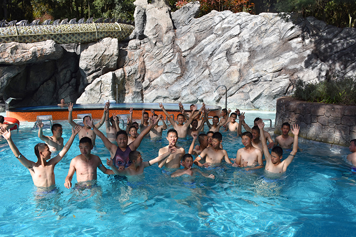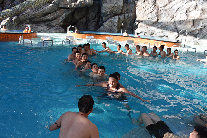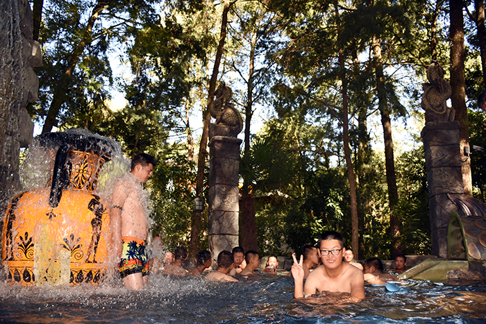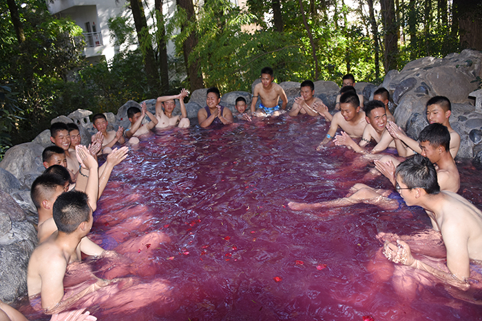 刺激項(xiàng)目體驗(yàn)結(jié)束后,孩子們成群結(jié)隊(duì)地到各種特色功能浴中一一享受。一入池中,大家便遙想起唐朝佳人楊貴妃溫湯美容的故事來,更何況,溫泉中設(shè)有薄荷、牛奶、鮮花、檸檬等養(yǎng)顏潤(rùn)膚浴,這是對(duì)當(dāng)代人的恩寵,會(huì)令楊貴妃自嘆不如,去責(zé)怨唐玄宗白當(dāng)了一世皇帝,倒不如去做安寧的普通市民,可美美享受森林溫泉的美容浴。親親魚療池中,魚兒親密接觸腳掌的酥癢,讓孩子們不時(shí)咯咯地笑出聲來,牛奶池、玫瑰池、中草藥池等等池中,更是留下了孩子們無數(shù)的歡聲笑語(yǔ)和吃著雪糕的無限滿足......有的池子本來容納不下太多人,但孩子們就是喜歡擠在一起,嬉戲調(diào)侃,不時(shí)擺拍留影,讓隔著屏幕看照片的人,都能感受到這個(gè)大家庭別樣的溫暖。