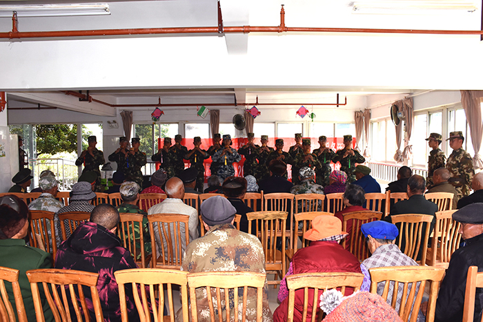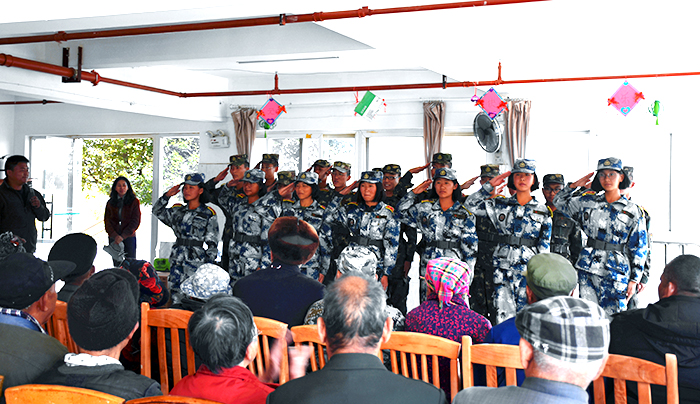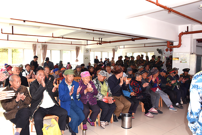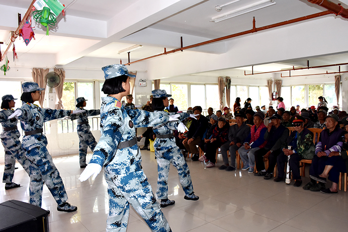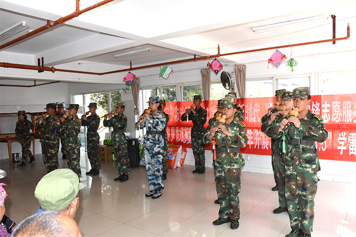 離別時(shí),孩子們用在校所學(xué)的葫蘆絲為老人們演奏了《荷塘月色》,瀟灑歡快地表演了《女兵操》,有的孩子還大膽上臺(tái)深情獨(dú)唱《異鄉(xiāng)人》,來自深圳的同學(xué)則用純正的粵語演唱了《光輝歲月》,最后還一起唱響了《學(xué)習(xí)雷鋒好榜樣》,共同祝福老人們身體健康,平安快樂。老人們聽后非常感動(dòng),不約而同地為孩子們豎起了大拇指,敬老院里不時(shí)有歡聲笑語傳出,讓暖陽下的敬老院格外溫馨。