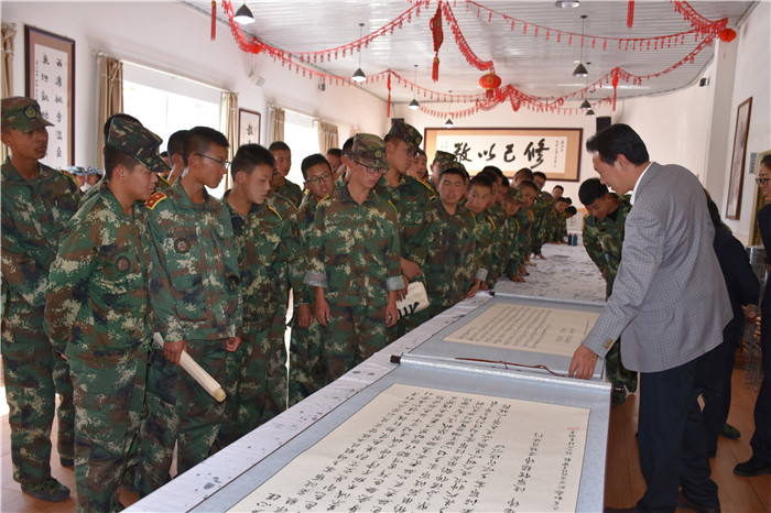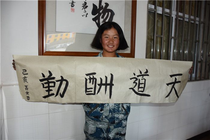 比賽尾聲,魯校長還把孩子們中間寫的好的書法裝裱,拿到現(xiàn)場展示,勉勵孩子們要向榜樣學(xué)習(xí):“同學(xué)們,這是你們的同學(xué)寫的書法,他們就生活在你們中間,離你們并不遙遠。他們?nèi)胄r也和大家一樣,什么都不懂,甚至連如何握筆都不知道,但經(jīng)過幾個月的學(xué)習(xí),進步顯而易見。不但字寫得好,而且心境也更加寧靜平和。我常常和大家說‘練筆,就是練心’,一個人如果僅僅把字練得爐火純青,他也只能成為‘書匠’,只有把握中華文化這個根基、深入體會中華文化中詩書禮樂的共性、領(lǐng)會經(jīng)典與美學(xué)的意義,才能可能成為真正的大師。所以,我也希望同學(xué)們能在這里靜下心來,好好學(xué)習(xí),寫端端正正中國字,做堂堂正正中國人!”