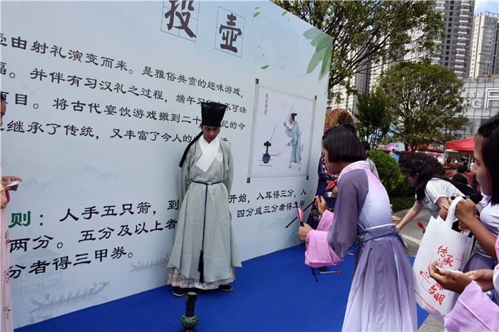 表演結束后,同學們還饒有興致地到遙岑樓書院參觀,臭美留影。隨后又興致勃勃地參加了 “旱地龍舟、投壺、漢服體驗”等多個端午主題游園游戲。孩子們玩得十分開心,每個游戲都全情投入,贏得了不少獎券,兌獎時,幸福難以言表。活動既具娛樂性,又更深入地踐行了時代文明新風,弘揚了中華傳統(tǒng)文化。