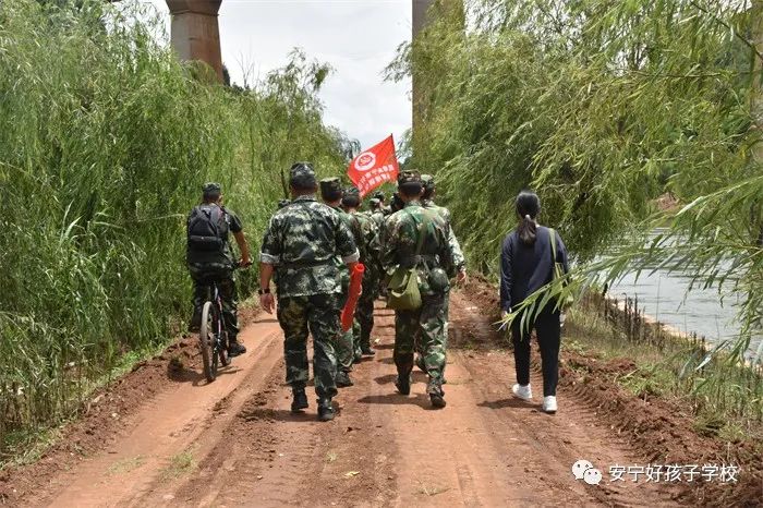 上午八點,全體學員迅速集合,背著行軍包,挎著小水壺,整裝待發(fā)。跟隨著一聲清脆的“出發(fā)”口令,同學們歡呼雀躍地開啟了旅程。孩子們沿著螳川河畔,順流而下。途中,學校還特意安排兩輛車拉上補給,緊隨同學們身后,認真做好充分的后勤保障工作。教員更是按1:2比例全程陪同。