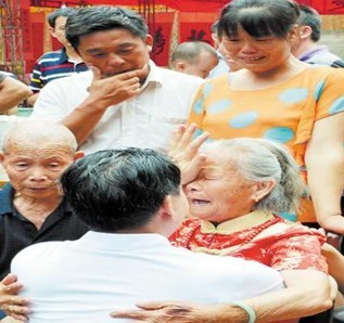 《北大校長周其鳳回瀏陽慶祝母親90大壽 長跪在母親膝前》的一組照片最先在瀏陽論壇上出現(xiàn)。組圖中,周其鳳跪在母親跟前,雙眼緊閉,緊抱著母親,母子兩人抱頭流淚,他看到母親老淚縱橫,輕輕為母親擦拭淚水,F(xiàn)場圍觀的群眾被這幅畫面所感動,有的鼓掌,有的跟著默默流淚。