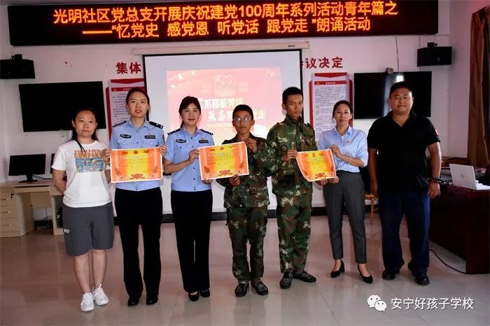 為隆重慶祝中國(guó)共產(chǎn)黨百年華誕,深入推進(jìn)黨史學(xué)習(xí)教育,傳承紅色文化,厚植愛(ài)國(guó)情懷,2021年5月14日,我校選派3名學(xué)生到光明社區(qū)參加“憶黨史 感黨恩 聽(tīng)黨話 跟黨走”朗誦比賽活動(dòng)。