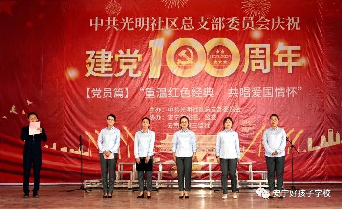 為隆重慶祝中國共產(chǎn)黨百年華誕, 2021年5月28日下午,我校參加由中共光明社區(qū)支部委員會主辦,安寧市紀委、監(jiān)委,云南省第三監(jiān)獄協(xié)辦的慶祝中國共產(chǎn)黨建黨100周年系列活動之“重溫紅色經(jīng)典•共唱愛國情懷”紅歌比賽活動。