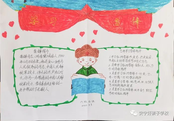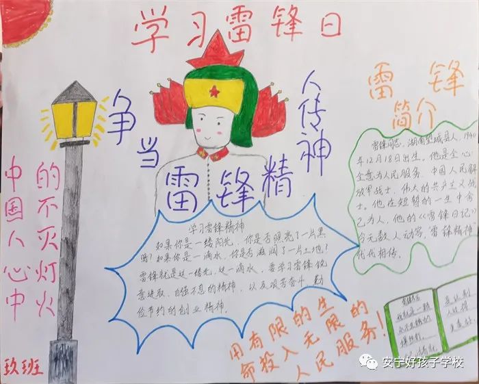重溫雷鋒事跡后,同學們被雷鋒無私奉獻的精神深深感動,積極地參與到手抄報活動中。大家分工合作,描繪輪廓、勾畫、涂色、書寫內(nèi)容等,以圖文并茂的形式,設計新穎的版面,展示出他們對“雷鋒精神”的所思所想、所感所悟。作品主題鮮明、內(nèi)容豐富、字跡工整清晰。有介紹雷鋒生平、故事、格言、日記的;有表達同學們對雷鋒的深切懷念和崇敬之情的;有發(fā)出學習實踐雷鋒精神的倡議的;有贊揚雷鋒“釘子精神”,歌頌他“全心全意為人民服務”的……
