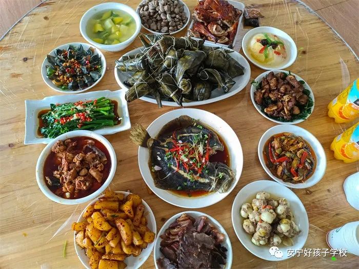 傍晚,一個(gè)個(gè)香氣撲鼻的“粽子”新鮮出爐端上了桌,一桌桌色香味俱全的盛宴便呈現(xiàn)在大家眼前。開飯前,尹校長向全校師生表示節(jié)日的問候與祝福,并語重心長地說道:“孩子們,今年的端午節(jié)對(duì)于大家來說,一定意義非凡,希望你們?cè)谶@個(gè)轉(zhuǎn)折點(diǎn),好好學(xué)習(xí),感恩自己的父母,做一個(gè)真正的好孩子,做一個(gè)對(duì)社會(huì)有用的人”。聽著尹校長親切又有力量的一番話,孩子們感動(dòng)不已。隨后,在尹校長“端午節(jié)晚餐現(xiàn)在開席”的一聲令下后,大家共同舉杯正式開始了晚宴。孩子們一邊吃著豐盛的晚餐,一邊迫不及待地解開升騰著熱氣的粽子,心滿意足地品嘗著自己的“作品”,笑容分外甜蜜。席間,尹校長還親切地走到孩子們中間敬茶祝福。看著教學(xué)中嚴(yán)厲的校長,生活中卻是如此關(guān)切地噓寒問暖、和藹可親,像父母,又像兄長,同學(xué)們高興不已!鏡頭下,孩子們不時(shí)向父母老師道祝福,和同學(xué)相共勉。