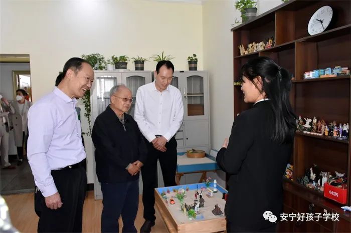 老省長懷著對學校的關心、關切之情,親切地走進學校的辦公區(qū)、教學區(qū)、生活區(qū)等全面查看。在走訪心理輔導室時,老省長駐足良久,饒有興致地和我校心理教研組長趙松瑞(國家二級心理咨詢師)做了深入的交流,趙老師還現(xiàn)場解讀了幾個沙盤的案例。隨后,在多媒體教室觀看了學校教學活動短片,全方位、深層次地了解學校。其間,魯校長就學校的辦學定位、發(fā)展理念、辦學特色、安全管理、辦學成績等逐一向老省長作了匯報。