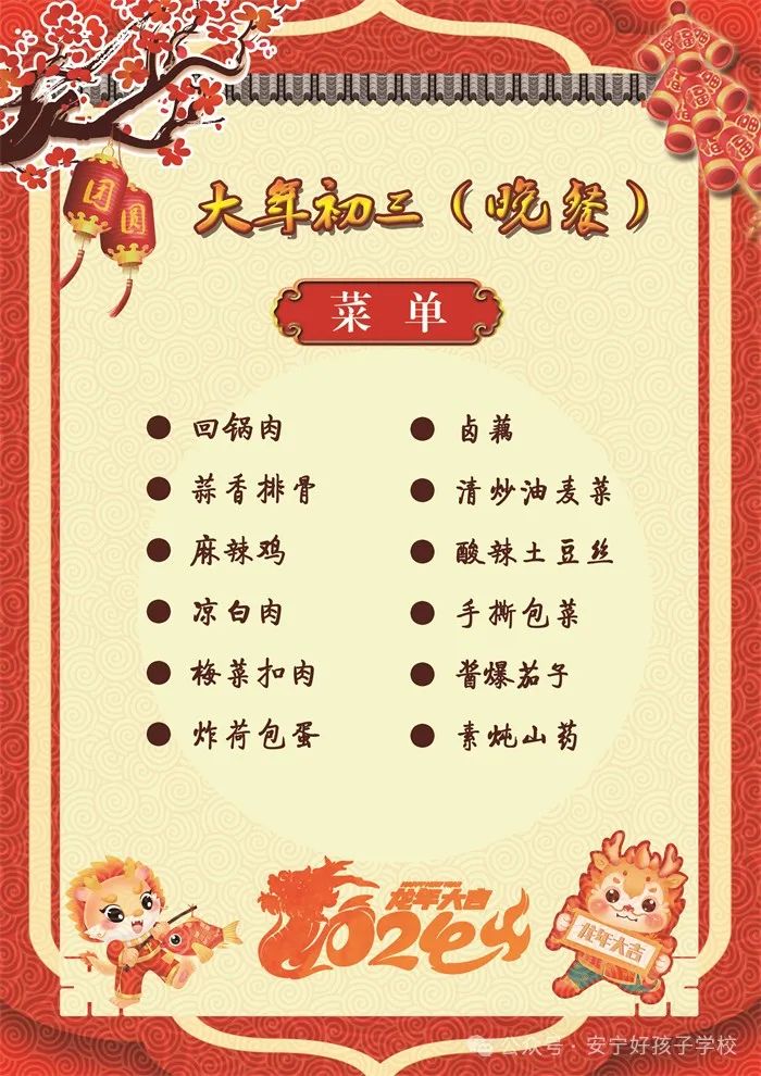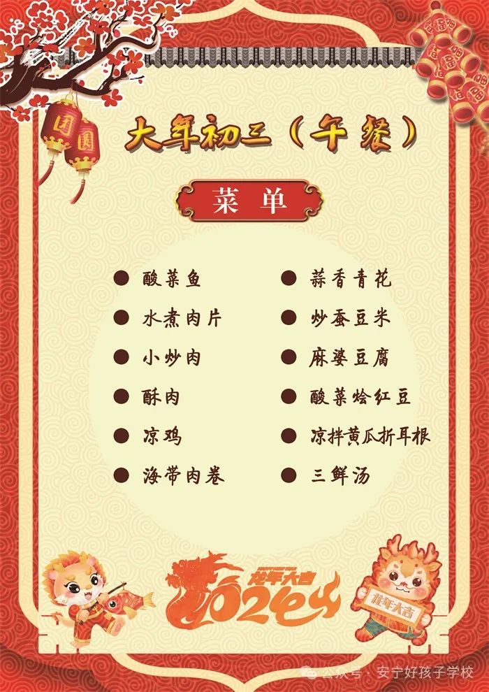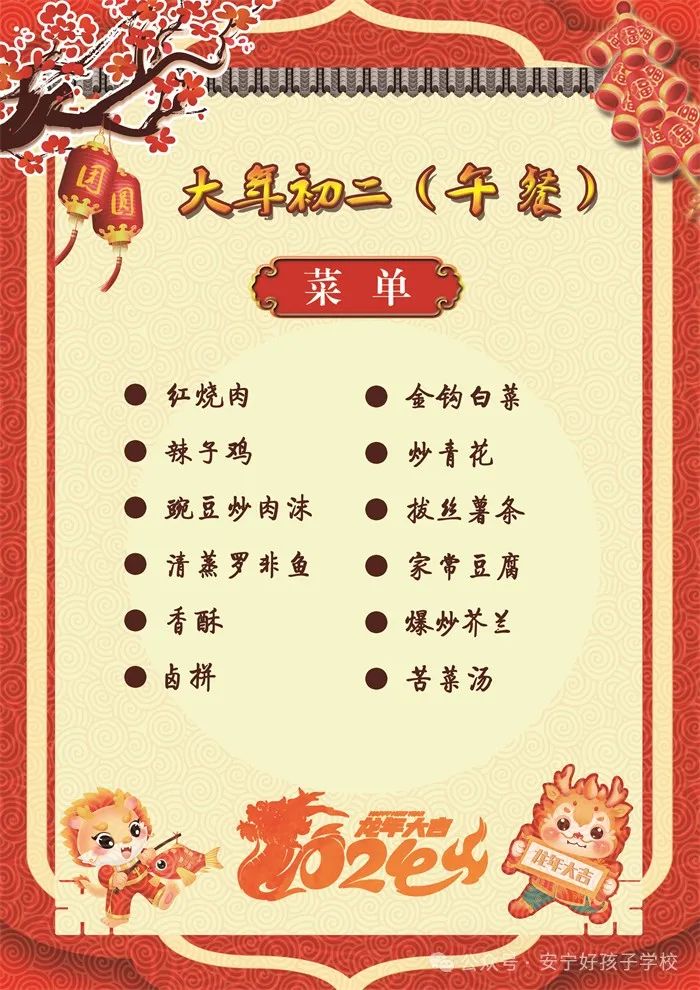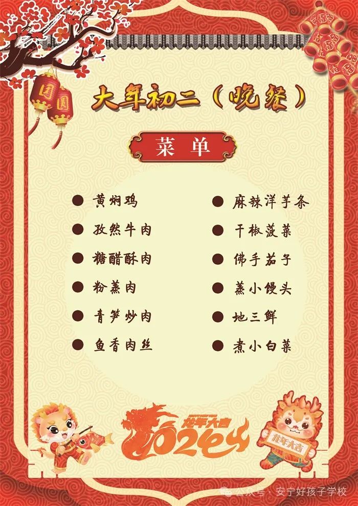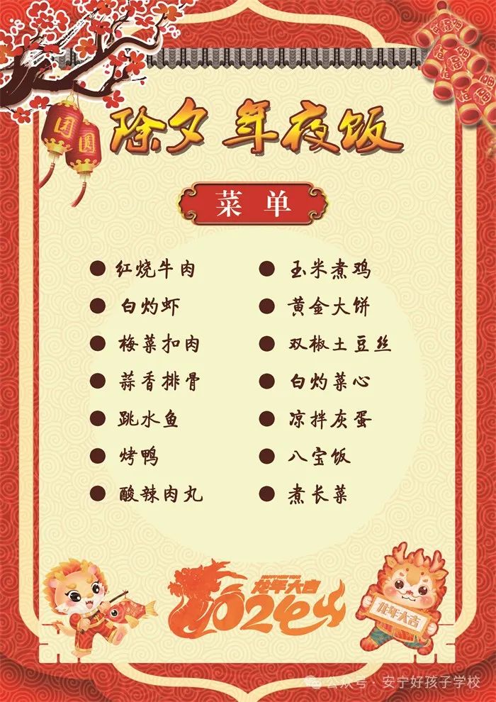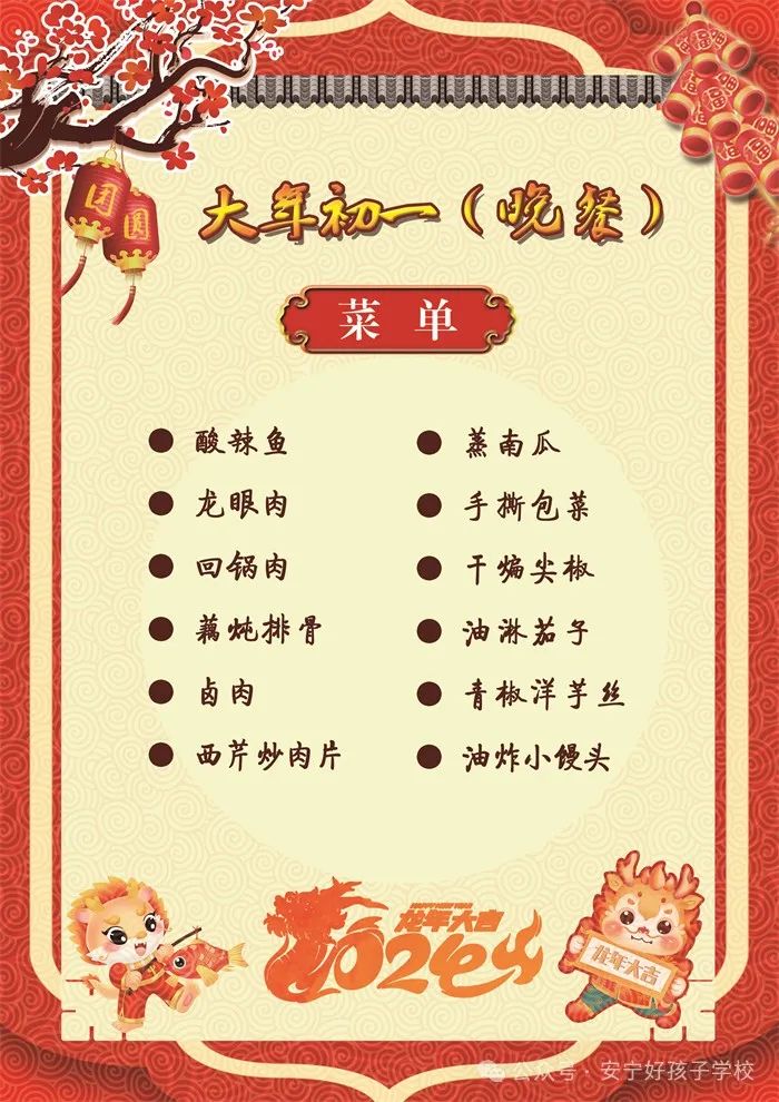 過(guò)年了 !孩子們吃什么?這是學(xué)校領(lǐng)導(dǎo)幾天來(lái)一直思考的問(wèn)題。經(jīng)過(guò)與學(xué)校營(yíng)養(yǎng)師、食堂廚師們多次商議后,本著營(yíng)養(yǎng)、健康、不浪費(fèi),又要保證孩子每餐都能吃上新鮮可口的飯菜,終于議定了菜單,現(xiàn)予以公布。祝孩子們新年快樂(lè)!祝全體家長(zhǎng)龍年吉祥、闔家幸福安康!