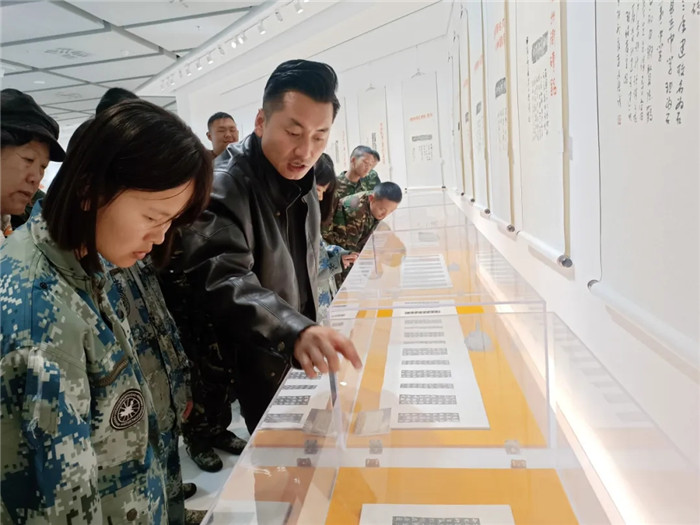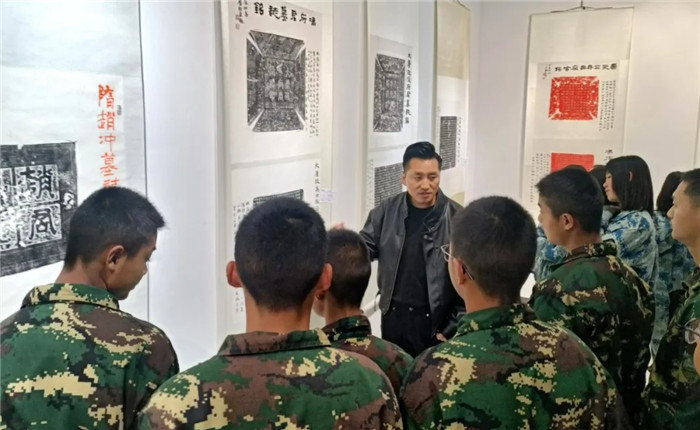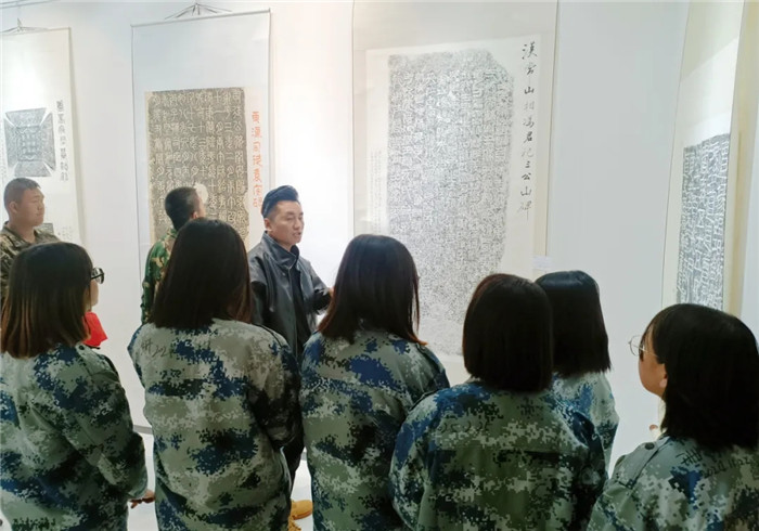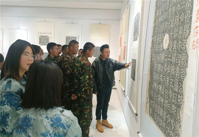 展覽突破傳統(tǒng)范式,兩位書法家創(chuàng)造性運(yùn)用“拓片為經(jīng),題跋為緯”的展陳邏輯,以篆、隸、楷、行、草不同書體題寫跋文,既有魏碑雄強(qiáng)筆勢(shì)與粗獷拓痕的張力碰撞,也不乏娟秀小楷與細(xì)膩紋飾的和諧共生。通過(guò)章法疏密、墨色濃淡的匠心,為師生呈現(xiàn)了一場(chǎng)跨越千年的文化盛宴,讓師生在斑駁的拓片肌理間遇見文明密碼,于翰墨丹青間傳承文化基因,感受“一紙拓千秋”的文化魅力。